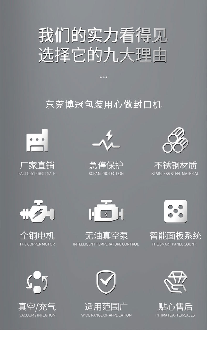 • 內抽式真空包裝機:將產品放入真空室內,關閉真空室門后,真空泵抽出真空室內的空氣,使包裝容器內達到預定的真空度,然后進行熱封合,完成包裝過程。